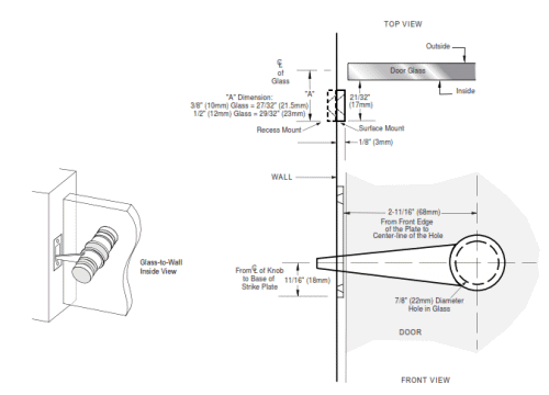 • Türverschluss für 8 bis 12 mm Glastüren, geeignet für Glas an Wand oder Glas an Glastüren. Der Türverschluss kann von beiden Seiten betätigt werden. Eine Lochbohrung von 22 mm im Glas erforderlich.