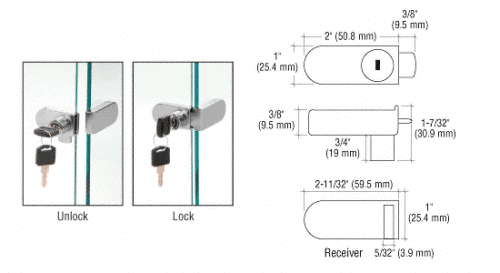 No-Drill Showcase Lock is designed for swinging glass doors and is easily installed by peeling off the adhesive liner and placing the Lock and Receiver in the desired location on the glass. No drilling or notching of glass is required. The No-Drill Lock can be used on any thickness of glass door or showcase.